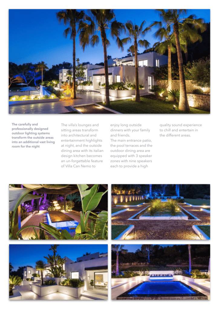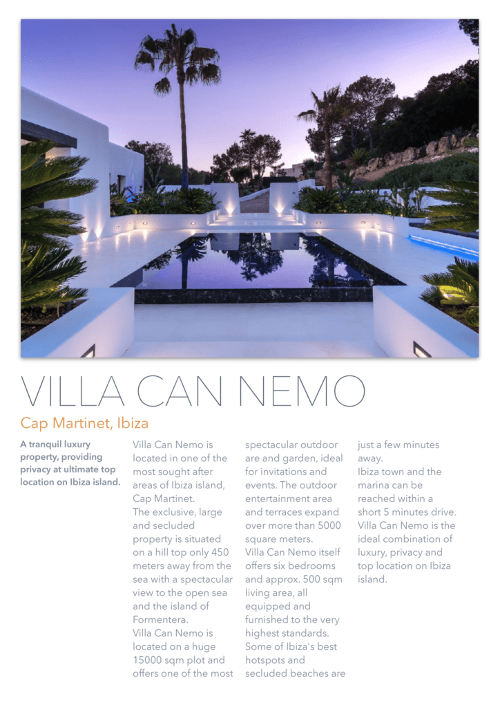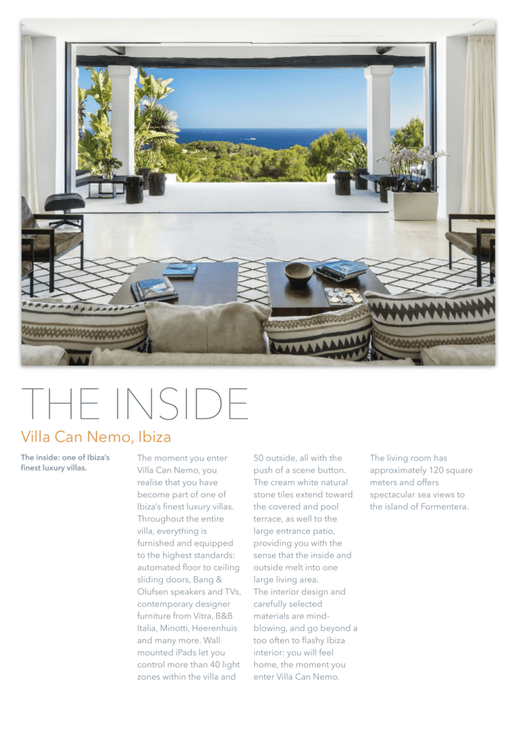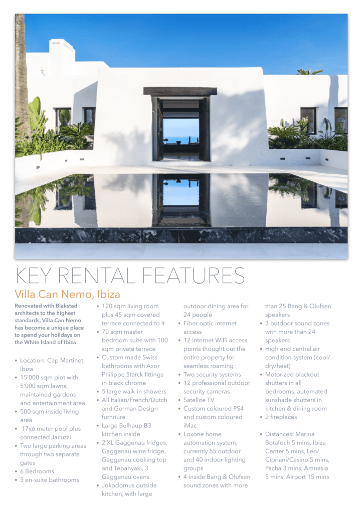 единенный отель расположен на вершине холма, всего в 450 метрах от моря, с потрясающим видом на открытое море и остров Форментера. Недвижимость находится в тихом районе рядом с Кап Мартине и деревней Иисуса. Некоторые из лучших горячих точек Ибицы и уединенных пляжей находятся всего в нескольких минутах ходьбы. До города Ибица можно добраться за 5 минут езды. Курорт Pacha Destino находится всего в 800 метрах от отеля, высококлассная площадка для вечеринок, до которой можно дойти пешком. Вилла CAN NEO также является идеальной арендной виллой для клиентов, которым требуется конфиденциальность и безопасность. Благодаря своему расположению, участок площадью 15000 кв. М имеет почти ровный и безопасный зеленый сад, окруженный соснами и высоким естественным забором. Чтобы сделать его безопасным по любому стандарту, 15 профессиональных камер видеонаблюдения покрывают всю внешнюю территорию и ворота с ее улицей. Высококачественная система сигнализации предлагает два режима работы: домашний режим и режим выезда. 24/7 служба безопасности получает предупреждение о срабатывании тревожного события (5 типов). Используя передовую систему домашней автоматизации, система сигнализации и все наружное освещение могут управляться из любого места в доме с iPhone или iPad, а также (по запросу) также могут быть полностью доступны, когда вы находитесь за пределами виллы.